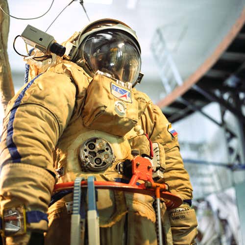This space suit was used in the Vykhod facility, where cosmonauts are suspended from the ceiling to simulate a spacewalk.