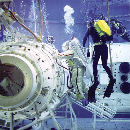Another way to simulate zero gravity is to train underwater. Here, a cosmonaut practises a spacewalk in Star City’s large training pool, which is 12 metres deep.