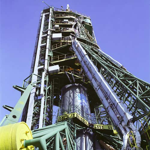 The launch pads at Baikonur have seen many rockets depart since Gagarin’s Vostok trip 50 years ago. Here, one of the recent Soyuz craft stands ready to depart on another mission.