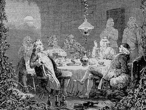 The Lunar Society of Birmingham was established in 1765 in England as a dinner club. It was so named because it held its meetings on nights when the moon was full, though not in pursuit of astronomy: moonlight helped members find their way home. In this painting they are meeting in the house of inventor James Watt; other members were also key figures in the industrial revolution. They included chemists James Keir and Joseph Priestley, physician and poet Erasmus Darwin, and ceramics pioneer, industrialist and abolitionist Josiah Wedgwood.