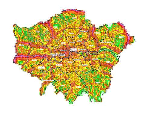 Maps like this show the ambient noise environment across large urban areas. Commissioned by the UK government’s environment department, this noise map of Greater London helps inform noise management policy.