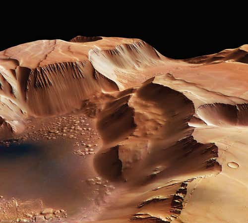 This image from the European Space Agency’s 2003 Mars Express mission was taken using a high-resolution stereoscopic camera. One of the mission’s objectives is to search for life on Mars, and also to understand the Red Planet’s atmosphere, geology and history of water. Some features suggest that large bodies of water lay on the surface around 3 billion years ago.