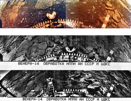 These images were taken by the Venera 13 and 14 probes, launched within days of each other in November 1981. Soviet engineers made the probes as hardy as possible to maximise their lifetime in the planet’s harsh conditions. As well as a surface pressure 90 times that of Earth and a temperature of 460 °C, the probes detected hydrochloric and hydrofluoric acids in the atmosphere.