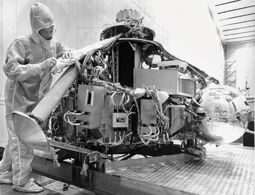 The US Viking mission in 1975 was the first to search for extraterrestrial life – in this case, on Mars. It was important to prevent biological contamination from Earth, so the landers were carefully prepared and covered in protective film.