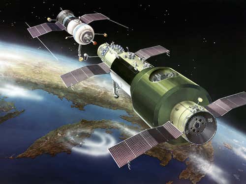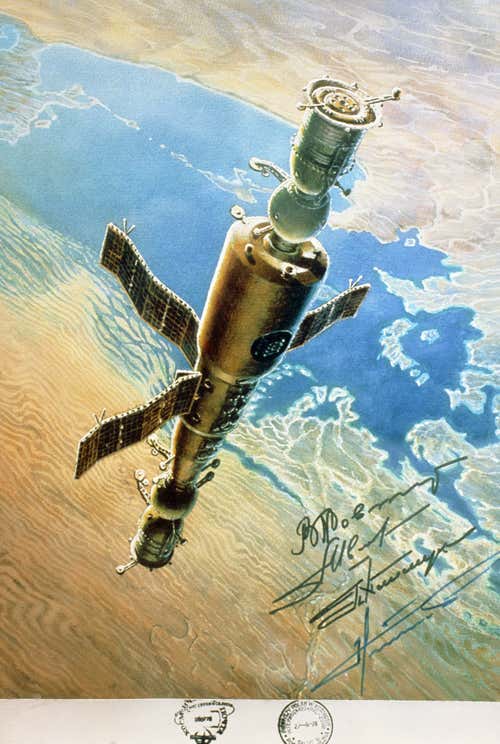The world’s first space station, Salyut 1 was launched on 19 April 1971. It spent only 175 days in orbit before it burned up in the atmosphere. It was visited twice, but the first crew couldn’t enter because of a docking problem. Equipment failure forced the second crew to leave after just 23 days. The three cosmonauts died during re-entry because of a malfunction in their Soyuz capsule.