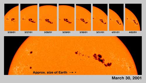 Why sunspot activity varies on an 11-year cycle remains a mystery, but maximum activity always occurs just before a flip in the polarity of the sun’s magnetic field. This sequence of pictures, taken by NASA’s Solar and Heliospheric Observatory (SOHO) in March 2001, just after a solar maximum, shows the evolution of a sunspot group with a length more than 13 times Earth’s diameter. Knowing the timing and likely intensity of solar maxima is especially important today for establishing the design specifications and timing of space missions.