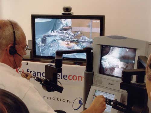 In less hostile environments, surgeons use telepresence to control robotic arms, for example in prostate operations. This photo shows one of the most impressive instances, when surgeons in New York used the technology to remove the gall bladder of a woman in Strasbourg, France.