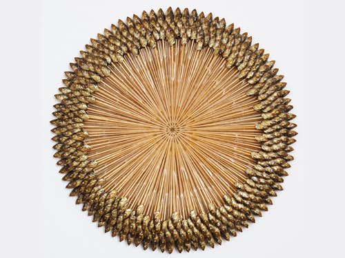 “Roulette is made from sardine heads skewered on bamboo sticks in the form of a spinning wheel. I called the piece Roulette because I feel that humans are gambling with their future, and that of the planet, for short-term gain,” says artist Tracy Henenberger.