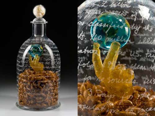 “This is the inspiration behind one of the jars in Apothecarium Moderne [on show in the Dead or Alive exhibition]. In this jar, a glass hand in a sea of locusts cradles the Earth just above to save it from drowning. On top of the vial I have placed a glass ball filled with condoms. Etched onto the jar’s exterior are frightening statistics about overpopulation, such as ‘2012 – Year that the world population will reach 7 billion.’ If this piece doesn’t raise awareness about overpopulation, nothing will.