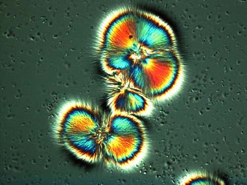 When he added water to the sample, the dormant microbes in it came to life: they can be seen squirming around in the background. Zach took the photo as the water evaporated, capturing the light as it reflects off the growing crystals.