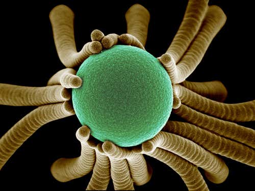 Taken with a scanning electron microscope, each “flower” is actually a bundle of 10-micrometre-tall pillars made from a polymer called polydimethylsiloxane. The initially liquid polymer is poured into a mould, where links between the polymer chains form, turning it into a soft, flexible solid.