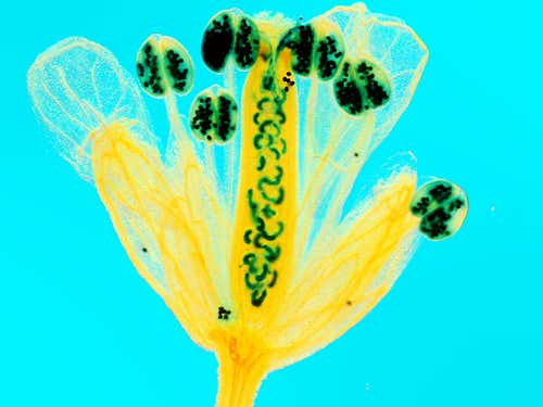 In the photo the pollen grains, ovaries and pollen tubes have been stained dark green; the background is blue and the petals and sepals yellow because of the imaging technique used.