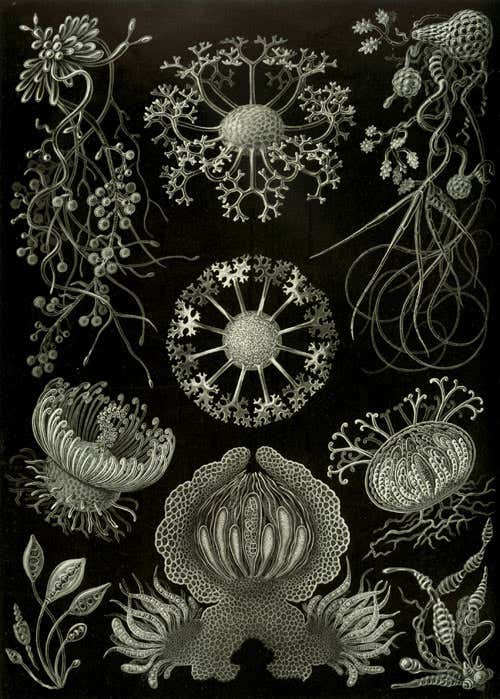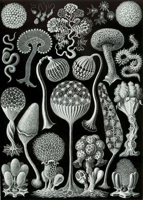 Slime moulds are known for their ability to act co-operatively, and this illustration of them was featured in the famous book Art Forms in Nature published by German biologist Ernst Haeckel in 1904. The co-existence of slime moulds with different shapes side-by-side in soil prompted biologist John Bonner to question whether natural selection was really driving these different forms.