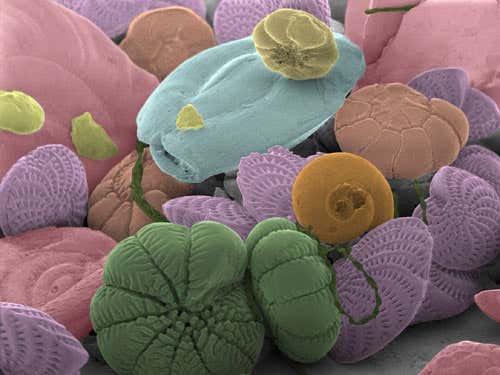 Foraminifera, also marine protozoa, form calcium carbonate shells containing several chambers. Around 270,000 species have been found, each with distinctive shells.