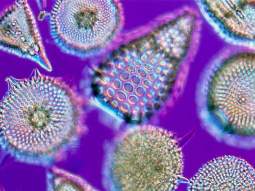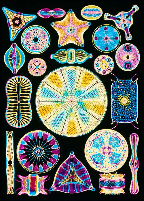 In the sea, organisms with very different shapes are also found living side-by-side. These diatoms illustrate the sheer range of diversity.