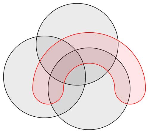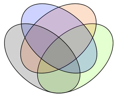 Venn diagrams get tricky when they include more than three sets – here, a fourth set has to be stretched across the other three.