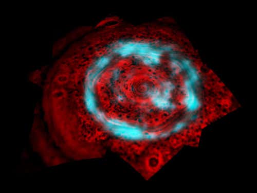Saturn has its own version of Earth’s spectacular auroras. As this composite image captured by the Cassini orbiter’s visual and infrared mapping spectrometer in 2006 shows, energetic particles crash into the upper atmosphere during winter in the planet’s polar north, causing certain regions (shown blue) to glow.