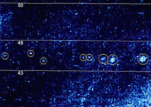 The largest and brightest region, on the far right of the image, is about 500 kilometres across and probably marks an area of high clouds illuminated by several bright lightning strikes.