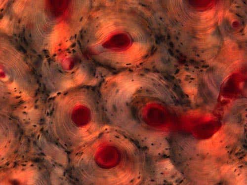 This image of compact bone from a human femur shows a network of tiny canals that contain blood vessels and connective tissue. Compact bone provides strength and rigidity in the body, and is composed of a layered matrix of organic substances and inorganic salts.