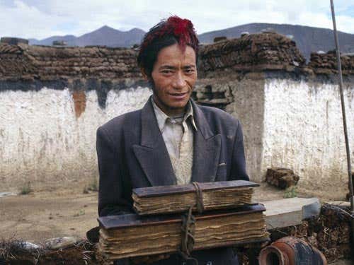 This photograph was taken in the remote Tibetan Autonomous Region, China, in 2003. It shows a doctor standing on the roof of his house and holding two precious medical books: a copy of the Tibetan medical classic Gyu Shi (Four Tantras), written in the 12th century, and a manuscript on medicines that was composed by members of his medical family.