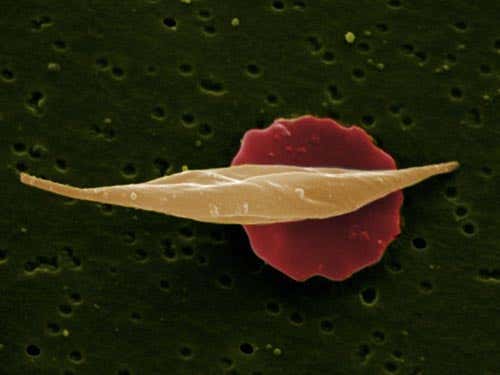 This image shows two red blood cells. A normal red blood cell is shown as a background to a red blood cell affected by sickle-cell anaemia.