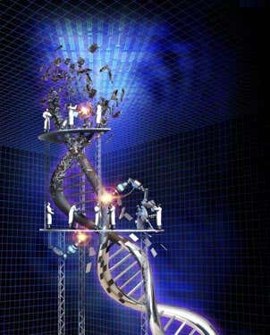 This montage of digitally enhanced pencil drawings by illustrator Oliver Burston represents the work being done by scientists as they manipulate a piece of DNA.