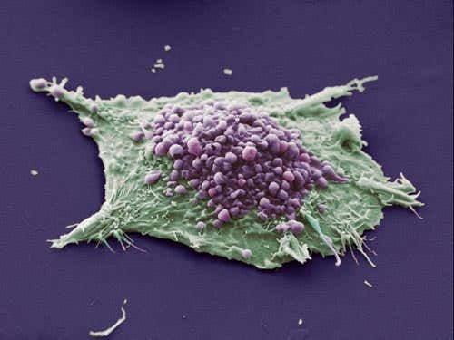 This scanning electron micrograph was also produced by Anne Weston. It shows a single cell grown from a culture of lung cancer cells. The irregular purple bulges are called blebs, a localised decoupling of the cytoskeleton from the plasma membrane caused by the cancer.