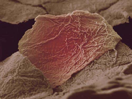 The object of study in this image comes from a burn that the artist, Anne Weston, received from boiling soup spilt on her hand. The burn-damaged skin cells are shown under a scanning electron microscope. This kind of curiosity is important in image-making as “you never know what you are going to find”, says Weston.