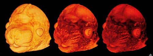 Using computer software, different structures within the head can be visualised. Colour channels can be added to the 3D reconstruction to highlight tissue density, as shown here.