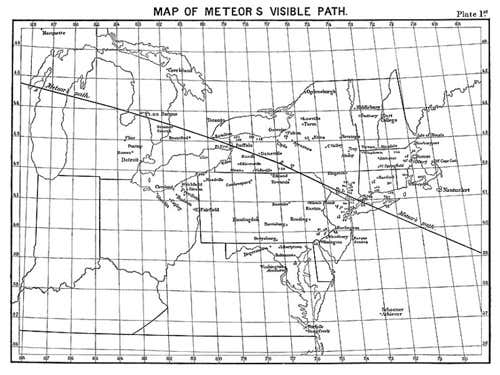 The meteor procession of 20 July 1860 passed from west to east over a ground track covering more than 1600 kilometres before the space debris appeared to escape from the Earth’s atmosphere over the Atlantic Ocean.