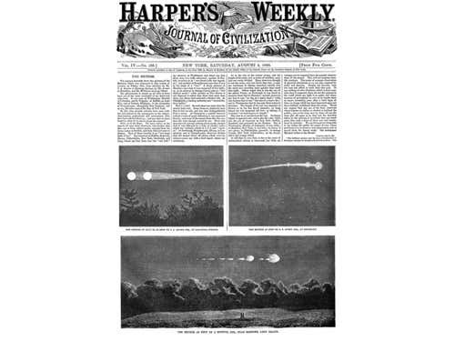 The meteor procession of 20 July 1860 was the subject of hundreds of news articles in North America, including a front page story in Harper’s Weekly. “I think this may be the most observed, and most documented, single meteor event in history,” says astronomical sleuth Donald Olson of Texas State University in San Marcos. “From the Great Lakes to New England – every town that had a newspaper wrote about the 1860 meteor.” Despite this, the procession had apparently faded so much from memory by the mid-twentieth century that researchers were not sure what Whitman’s poem referred to.